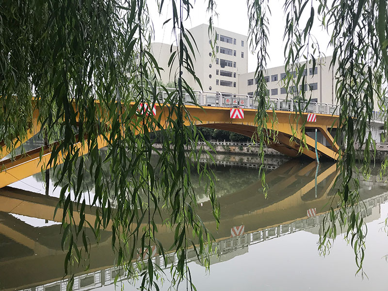 This is a modern bridge with its body painted orange. Located in a desolate area with old buildings, this bridge does not have many people or cars walking or driving by; there is one person fishing on the top of the bridge when I visited this bridge.